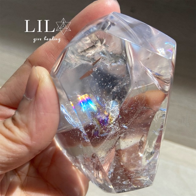 大きく濃い虹が沢山入った、キラキラのクリアクォーツ/水晶フリーフォームです☆ 透明感抜群!!とにかく虹虹虹!!!!の とってもキレイでうっとりするほどです✨ お部屋のアクセントや、瞑想のお供にもおススメです!! ◆効果◆ 水晶は、「すべてを浄化し、整える万能石」と呼ばれる、天然石の中でも特にポピュラーで信頼されている存在です。 透明でクリアな見た目の通り、 持つ人や空間のエネルギーをリセットし、フラットな状態へと整えてくれる働きがあります。 ネガティブな感情を浄化したいとき、 集中したいとき、気分をすっきり切り替えたいときにそっと寄り添ってくれる石です。 また、他の石との相性も良く、 「エネルギーを増幅・調整する石」として、お守り代わりに持ち歩くのにもぴったりです。 【原産国】ブラジル 【サイズ】 大きさ:約8×5.7×5.6cm 重さ:約252g
