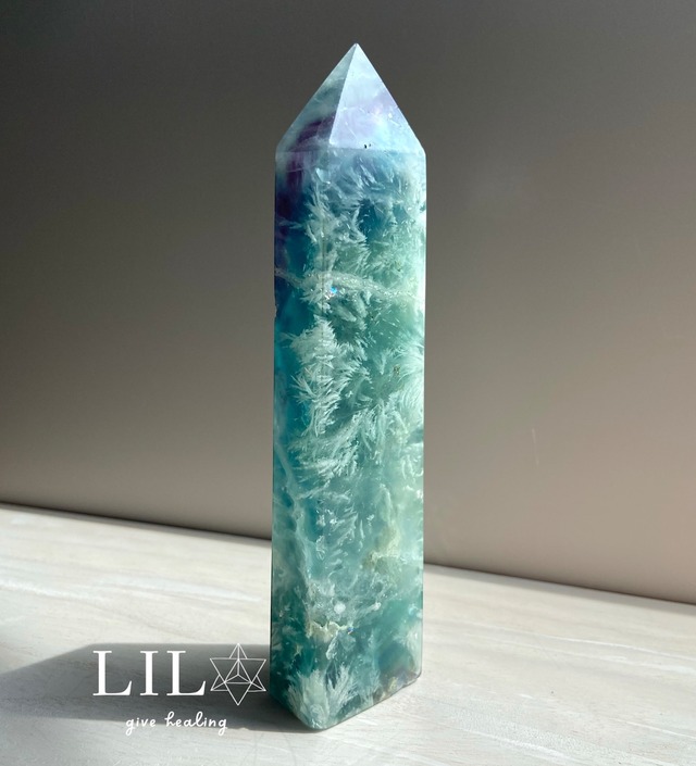 フローライト(蛍石)の中に羽状の白い内包物が見られるとても珍しいフローライトポイントです。 まるで天使の羽を閉じ込めたような神秘的な模様から、「エンジェルフェザーインフローライト」と呼ばれています♡ 四角柱で、角度によって全く違う表情です。ジオードもあります。 所々にチラチラ虹も見えます✨ ※ジオード(Geode)とは、内部に空洞があり、そこに美しい結晶が形成された天然の鉱物のことです。 【フローライト】 「天才の石」や「知性の石」といった意味があります。そのため、この石を持つと思考を引き出し、発想力・記憶力・集中力を高める効果が期待されます。勉学に励む人に好まれ、受験や試験のお守りとしても人気の高い石です。 もうひとつ、フローライトには「心の石」という意味があります。持っているだけで不安を和らげ、ストレスを取り除き、心と体のバランスを整える手助けをしてくれるでしょう。 強いヒーリング効果があるため、深い癒しをもたらす石として、瞑想やリラクゼーションのにもおススメです。 こんな人におススメです。 ・自然な感性、喜び、素直さを再び甦らせる ・試験合格を目指し勉強されている ・日々の疲れから開放されたいいつも心身にストレスを感じている ・悩みを解決して頭の中をスッキリとしたい ・迷いをなくしたい ・集中力を高めたい 原産国:中国 【サイズ】 高さ:約17cm 太さ:約4cm 重さ:約365g