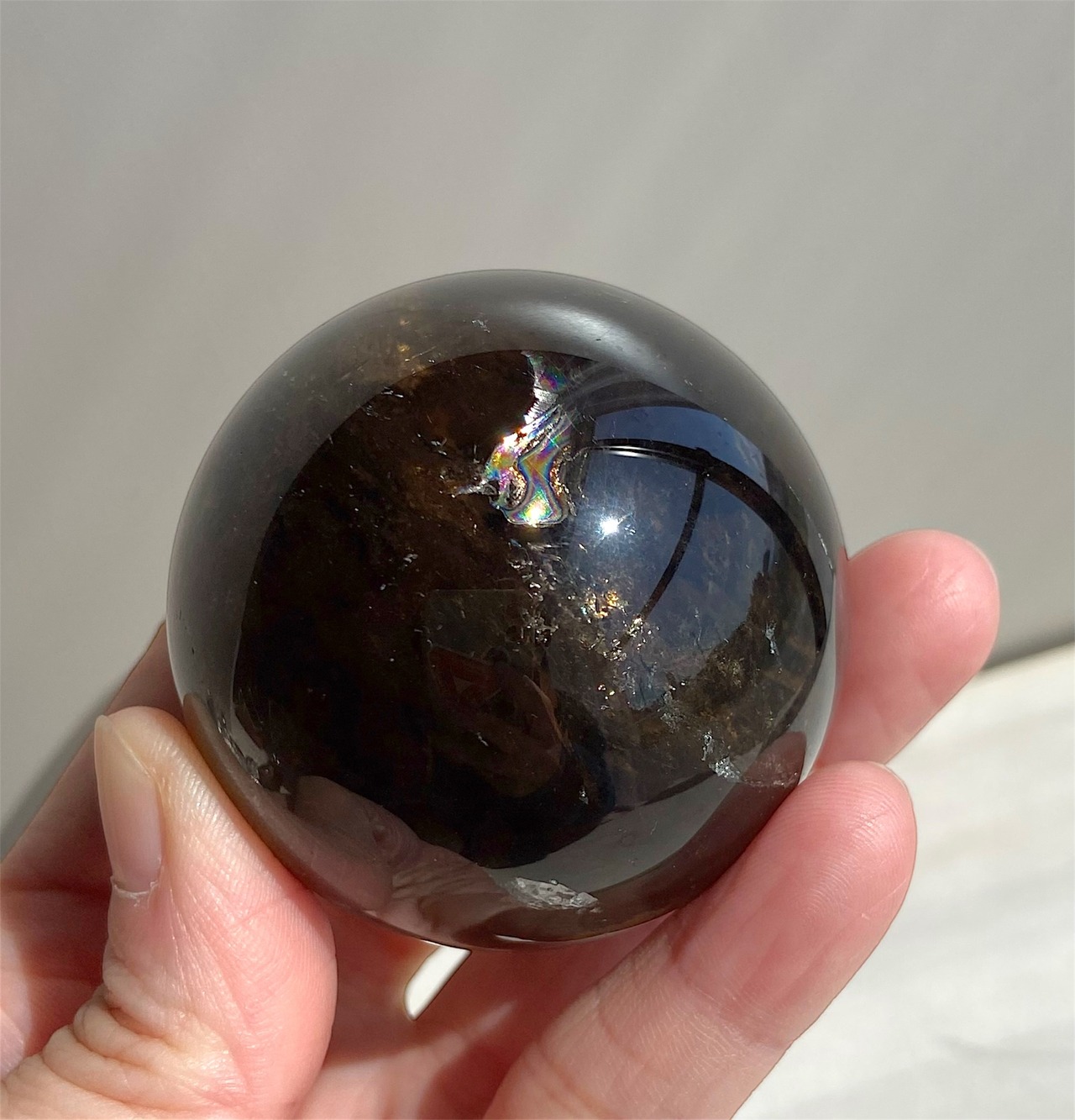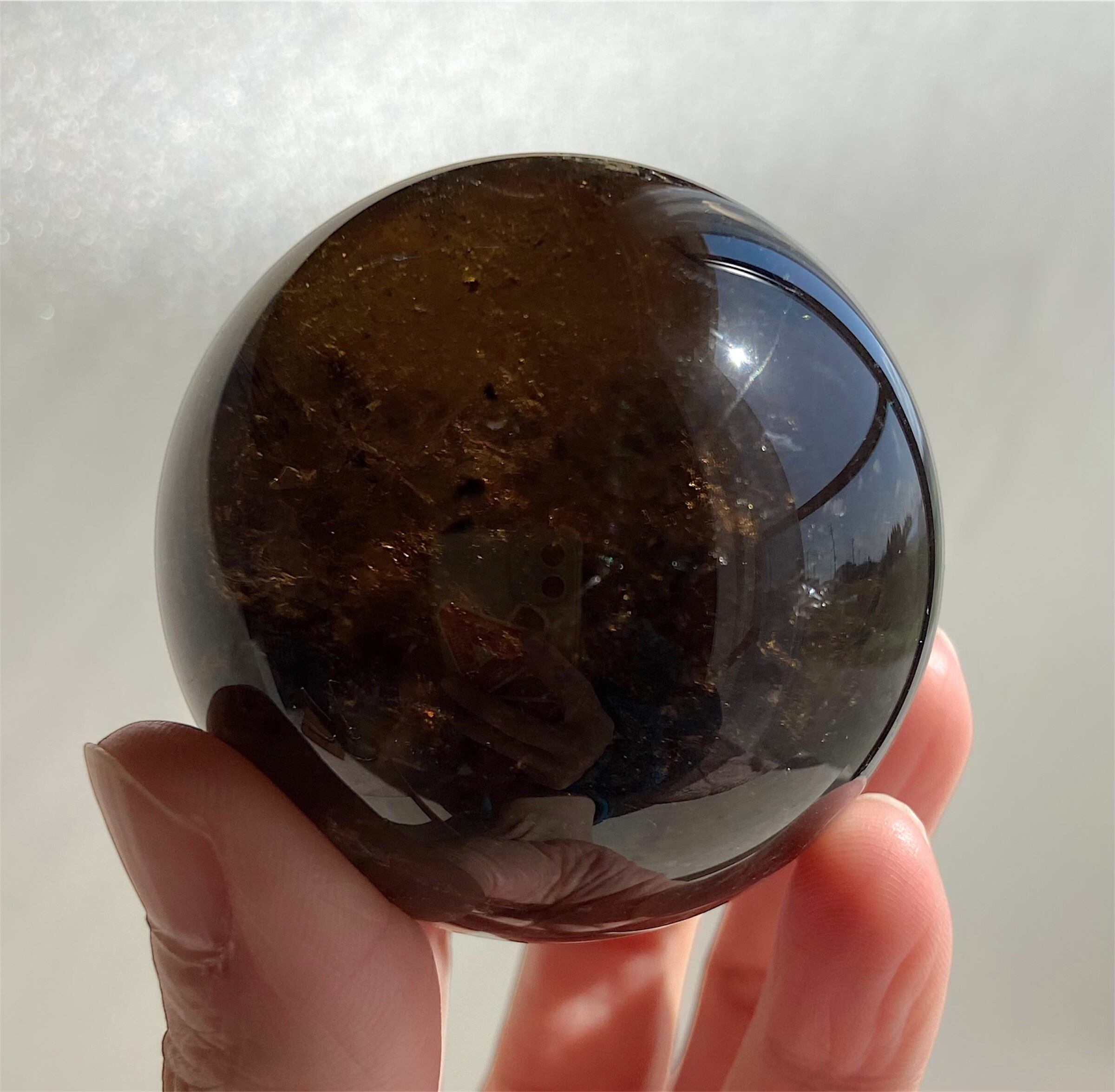 濃いブラウンの中にクラックが多く虹も見えるスモーキークォーツのスフィアです。