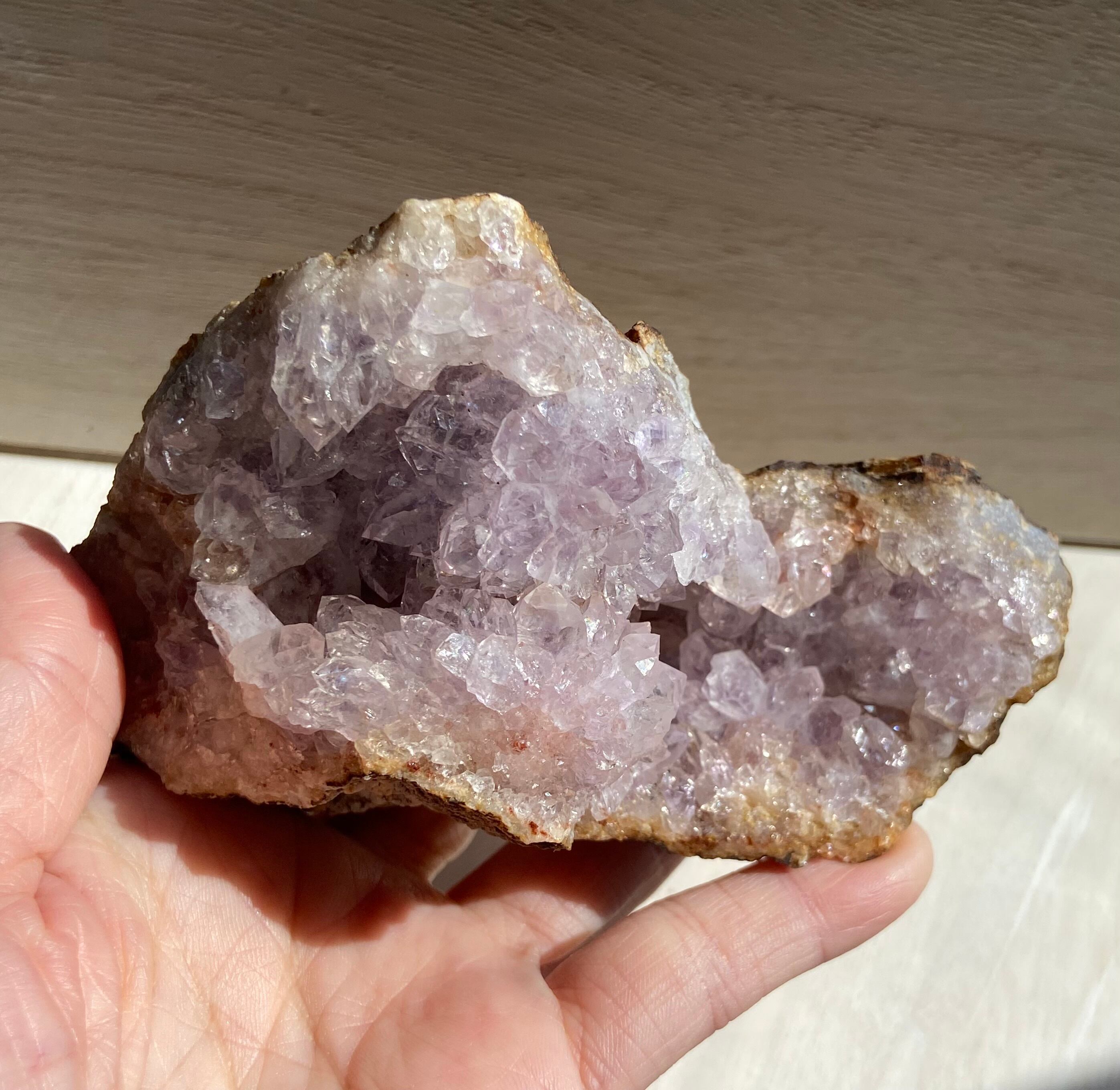 淡くやさしい桜色の結晶が、美しいピンクアメジストのジオードクラスター。
