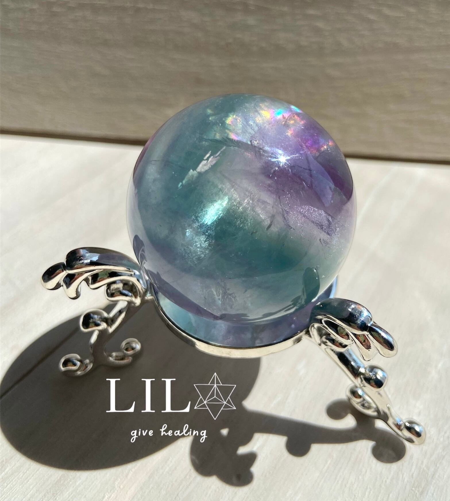 パープル&グリーンのバイカラーフローライトスフィアです。