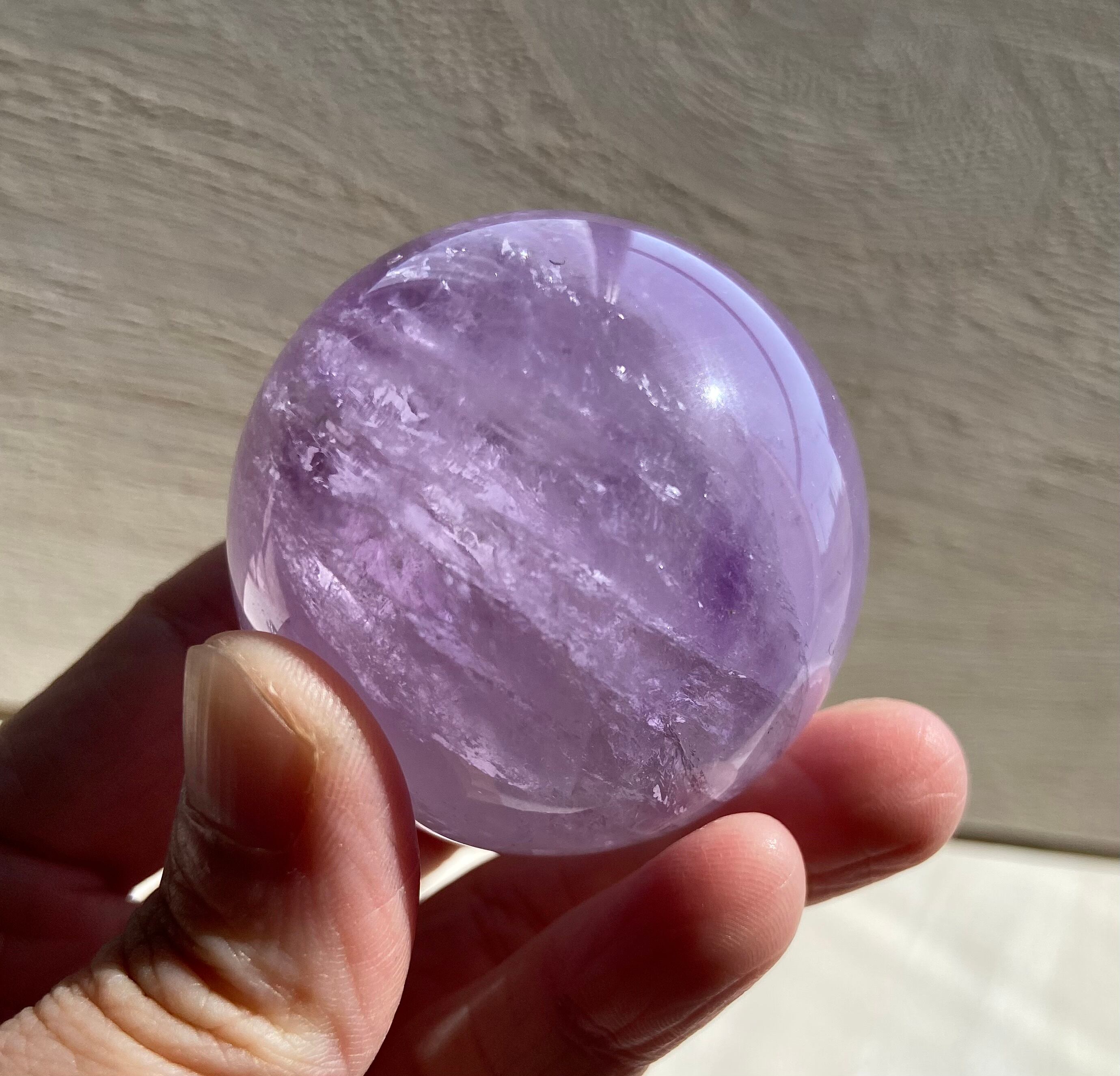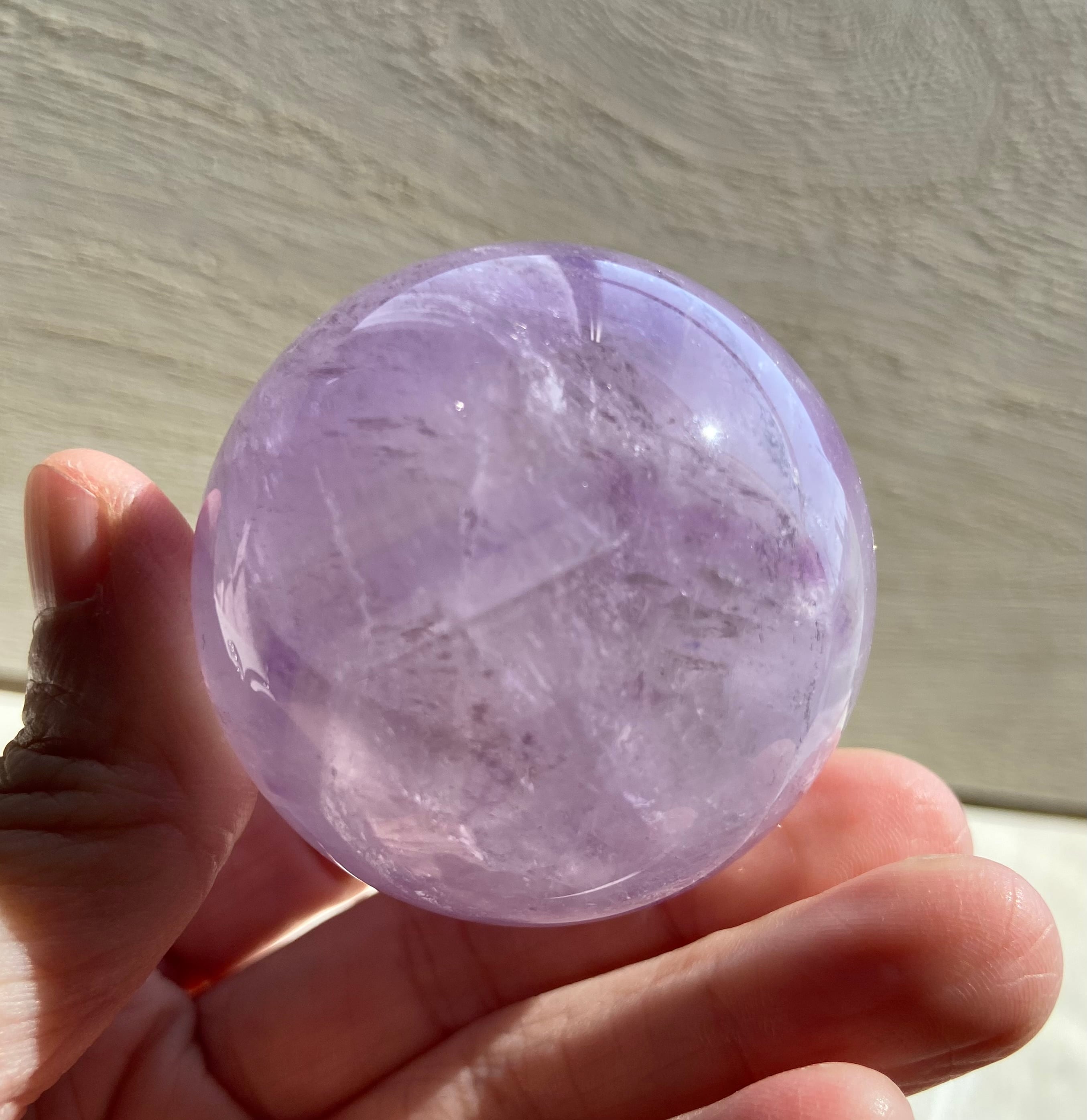 やさしい紫色が見た目にも心にも穏やかな癒しをもたらしてくれるラベンダーアメジストのスフィア(丸玉)です。
