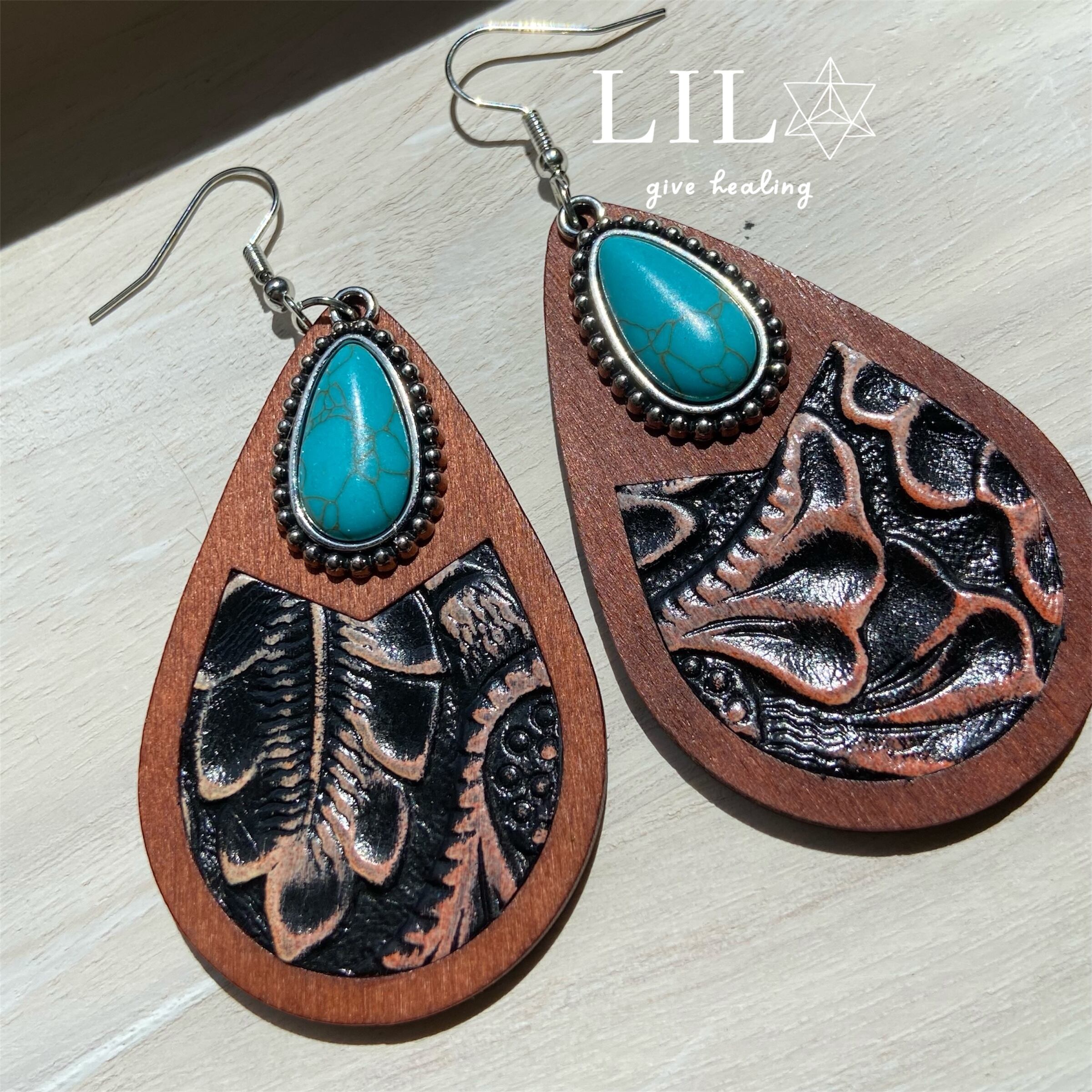 素材には、ターコイズ(天然ではありません)、温かみのあるウッド、そして本革を使用しています。