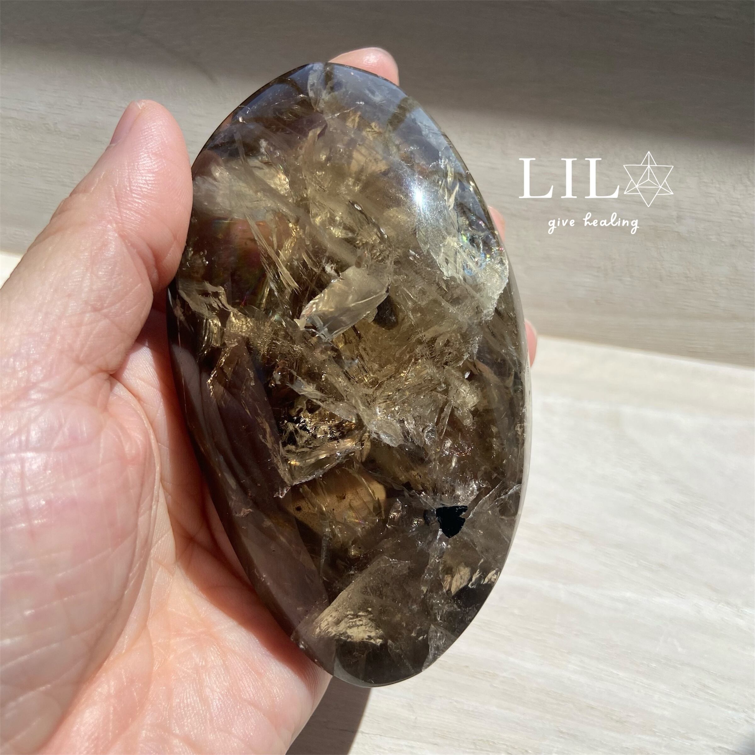 透明感抜群、たくさんの濃い虹があるスモーキーっぽい色合いのシトリンです。手のひらで収まらない大きめパームです。