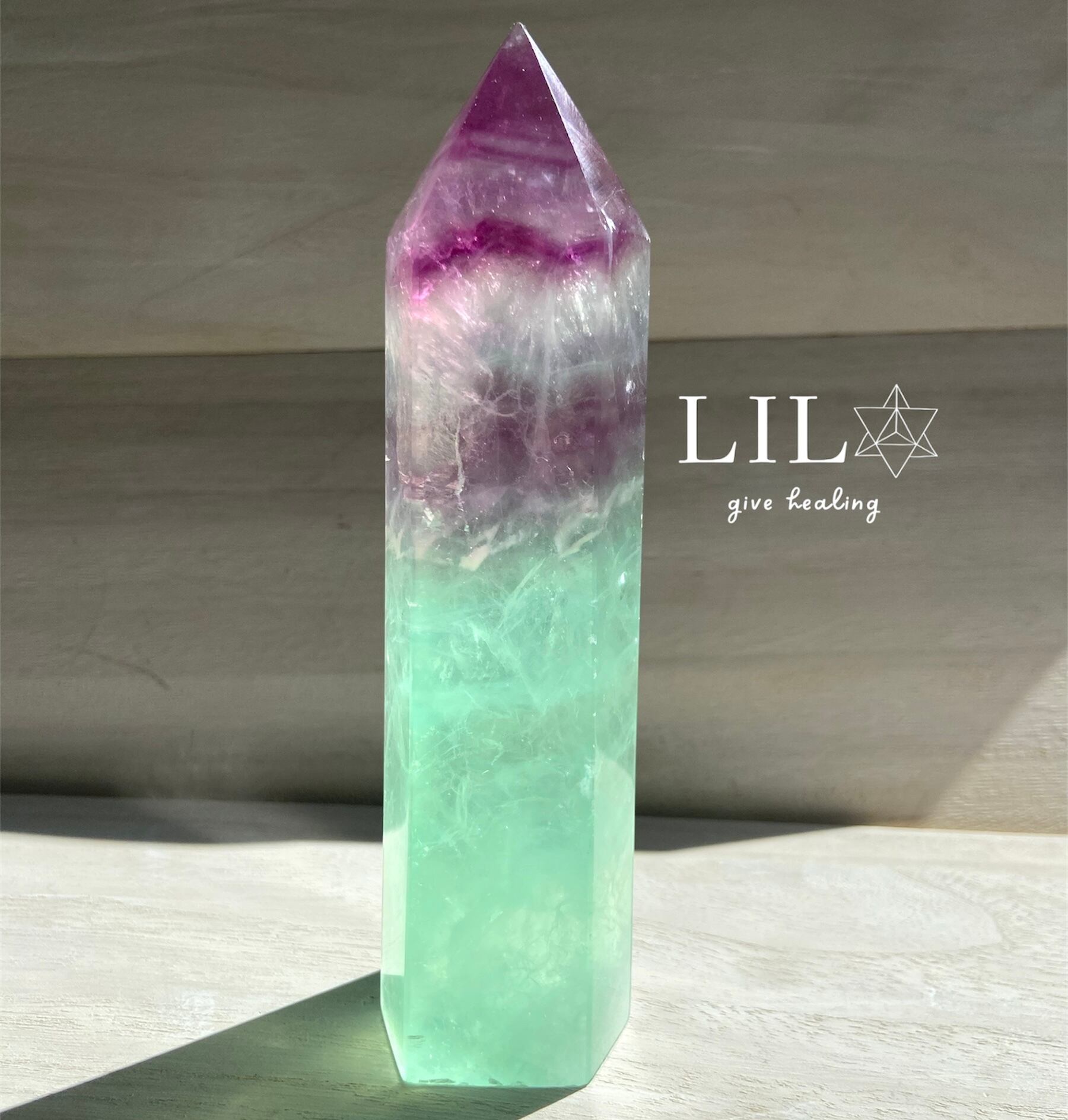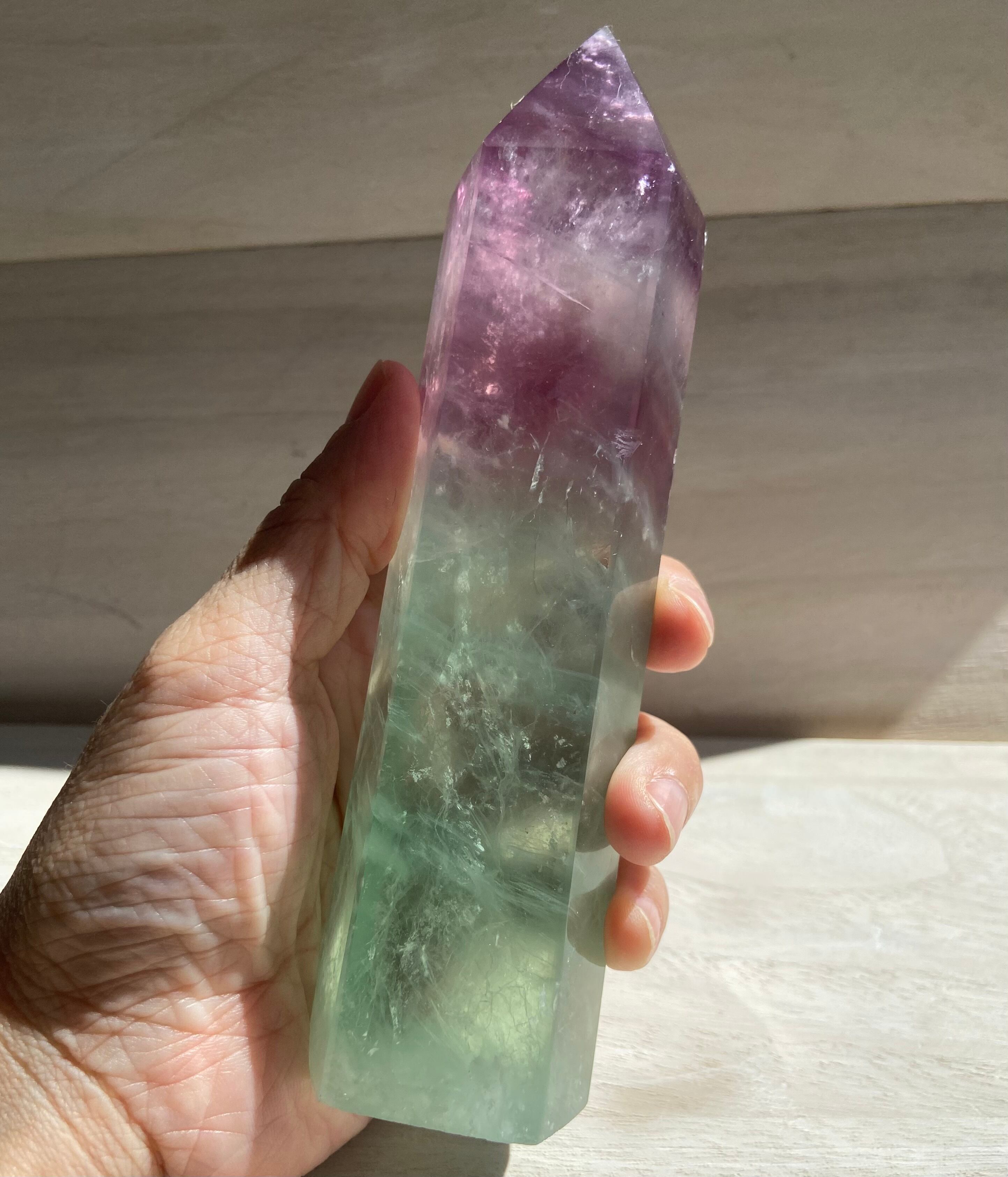 透明感のあるグリーンからパープルへのグラデーションが美しい、天然のフローライト六角柱♡