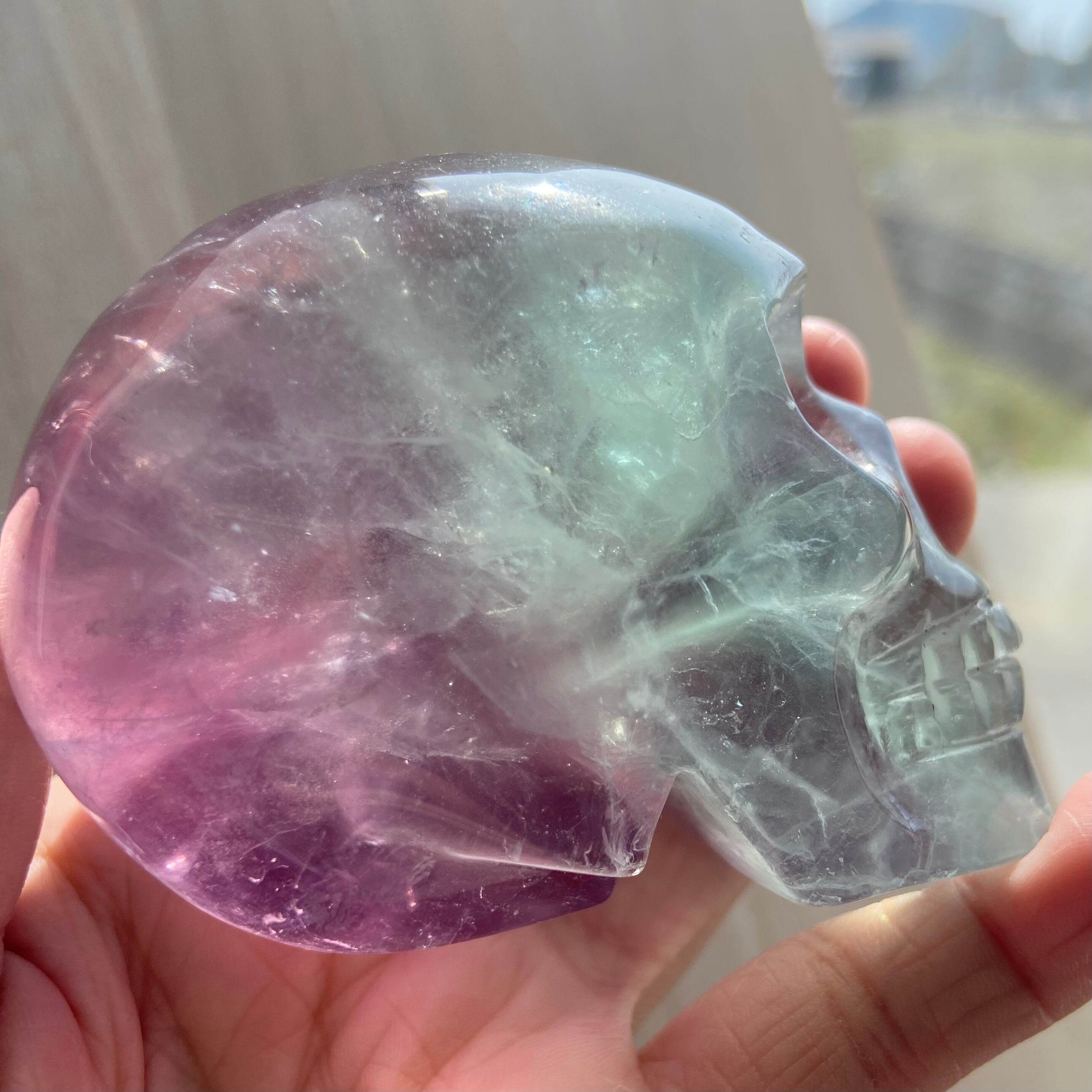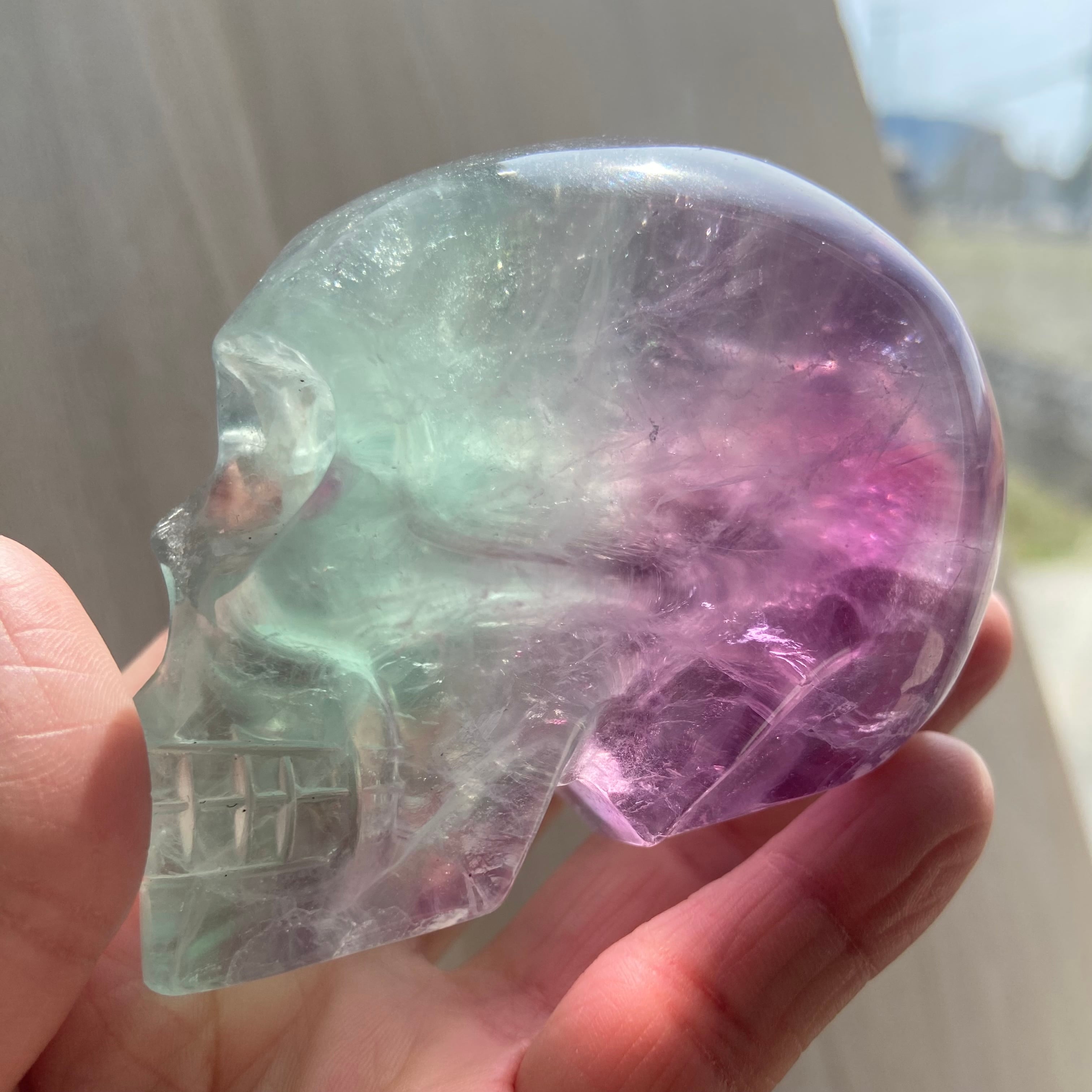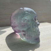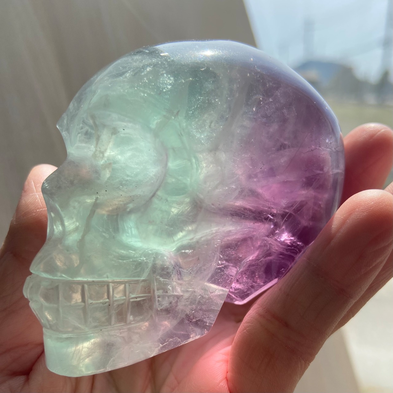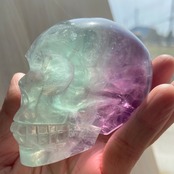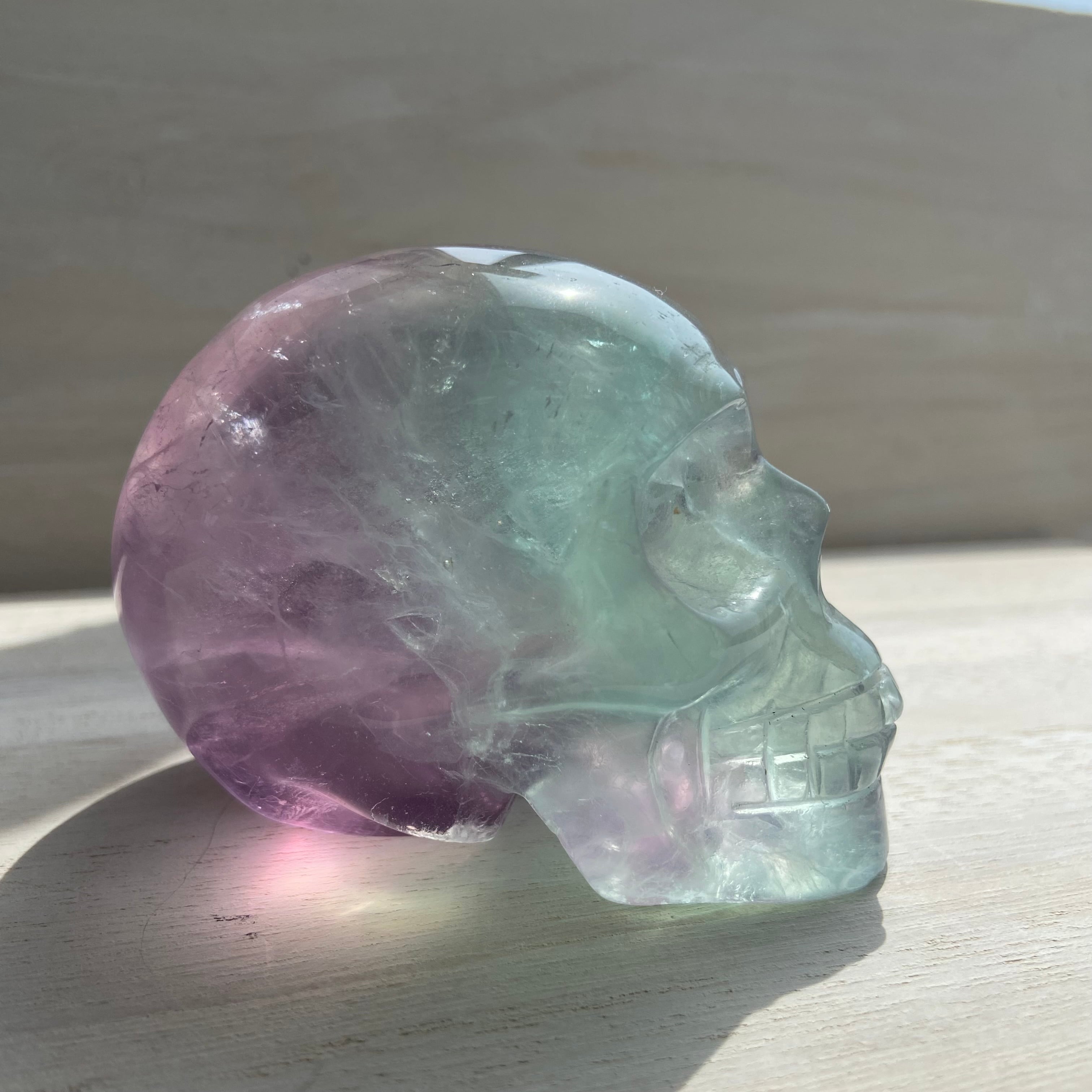バイカラーフローライト スカル 約8cm|高透明 グリーン×パープルの美しいグラデーション