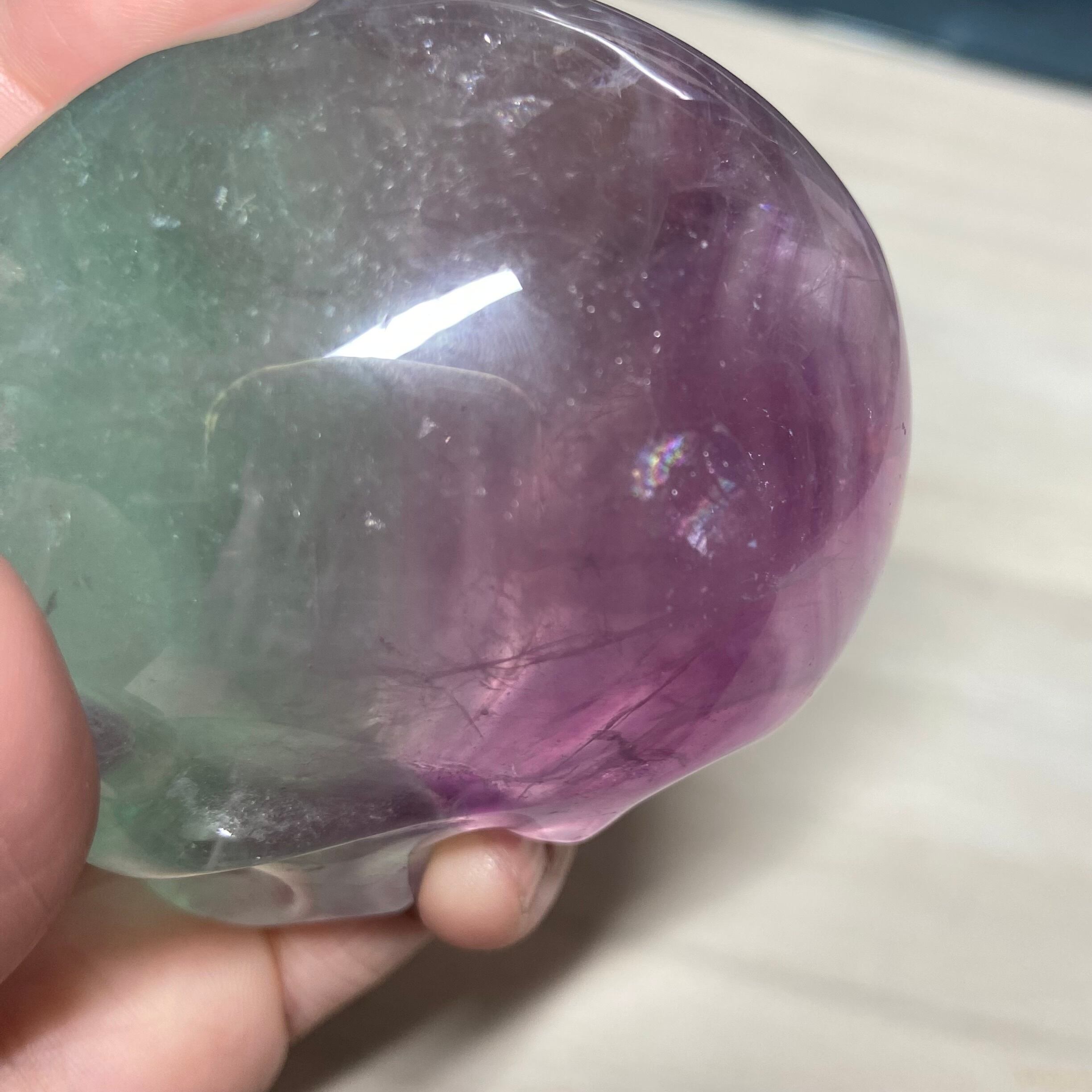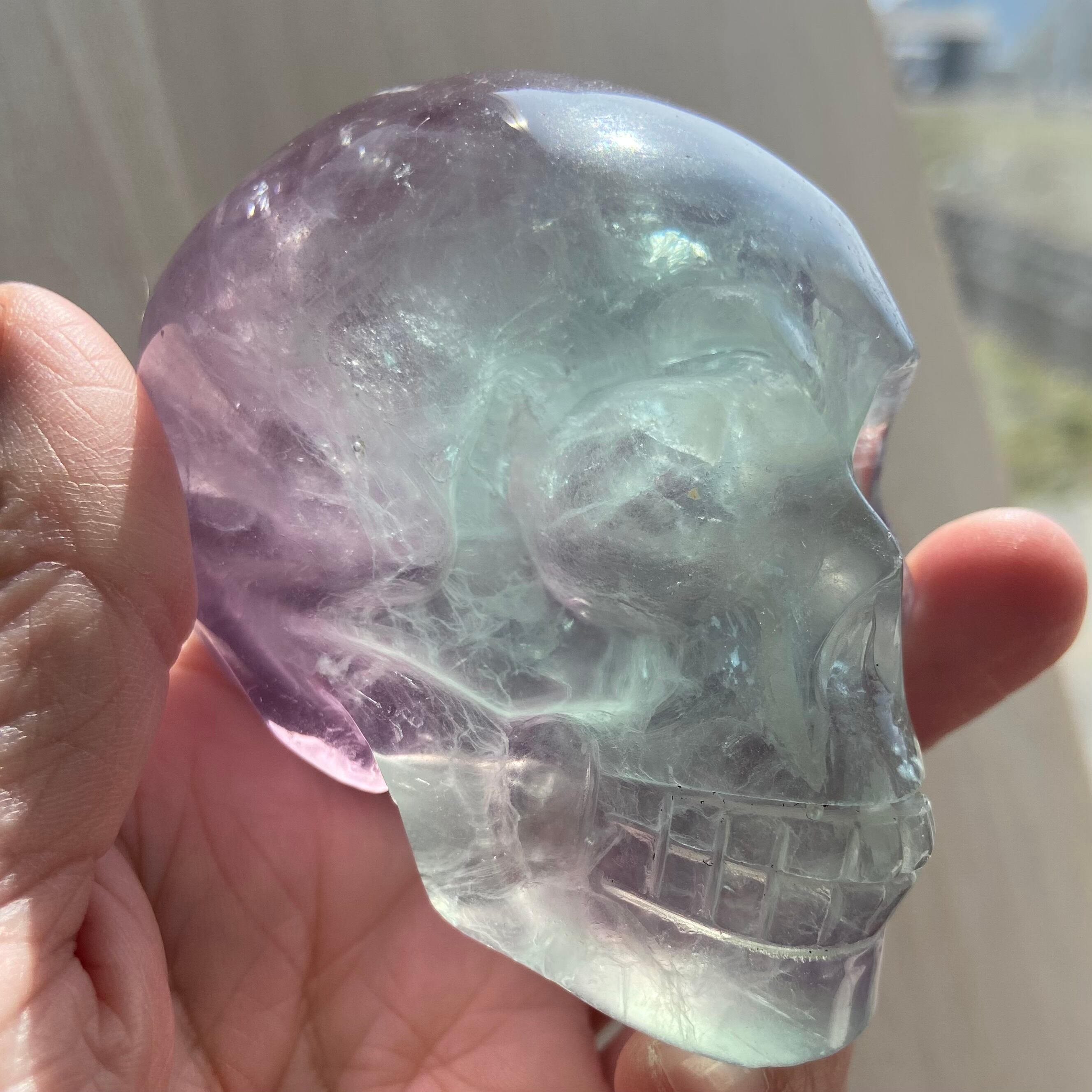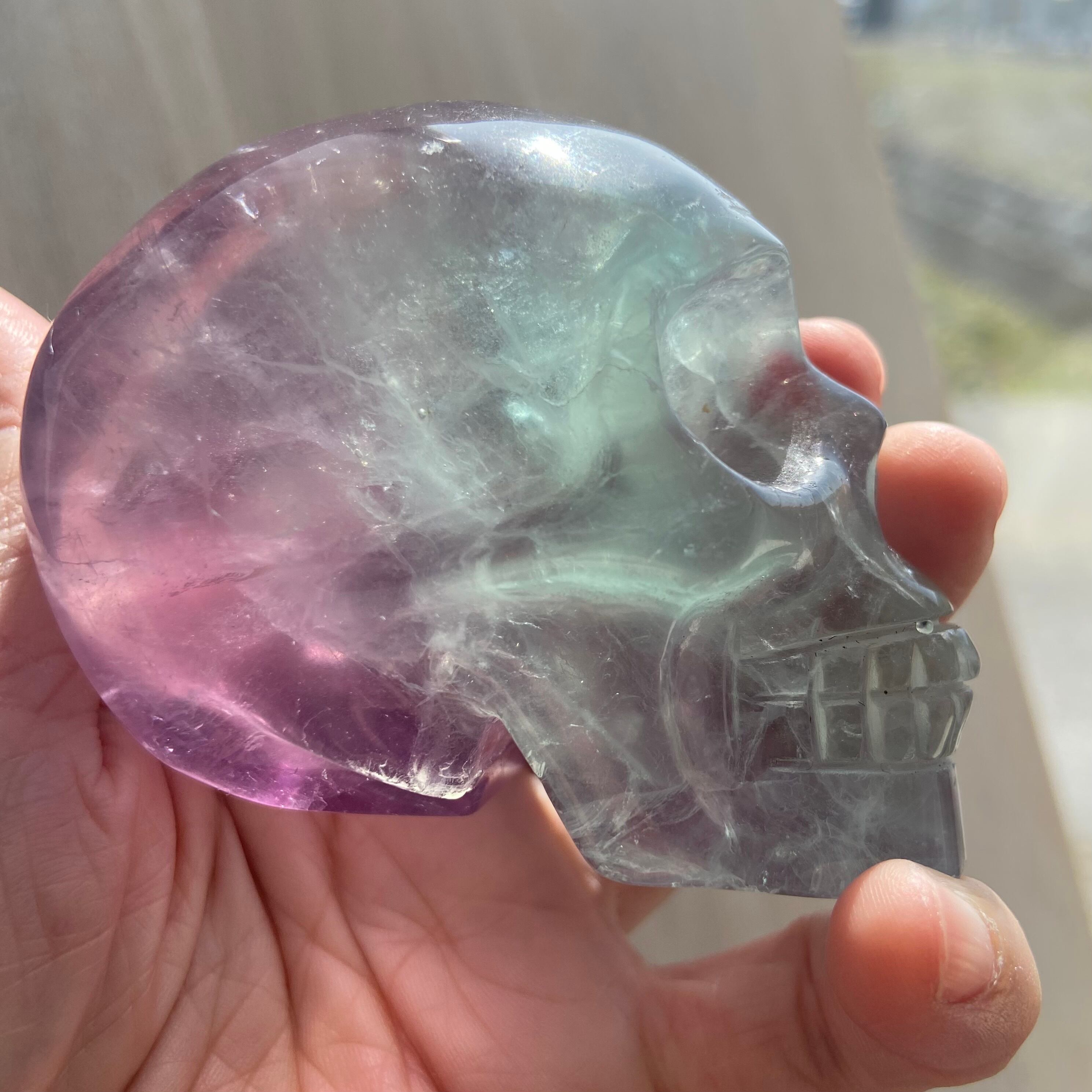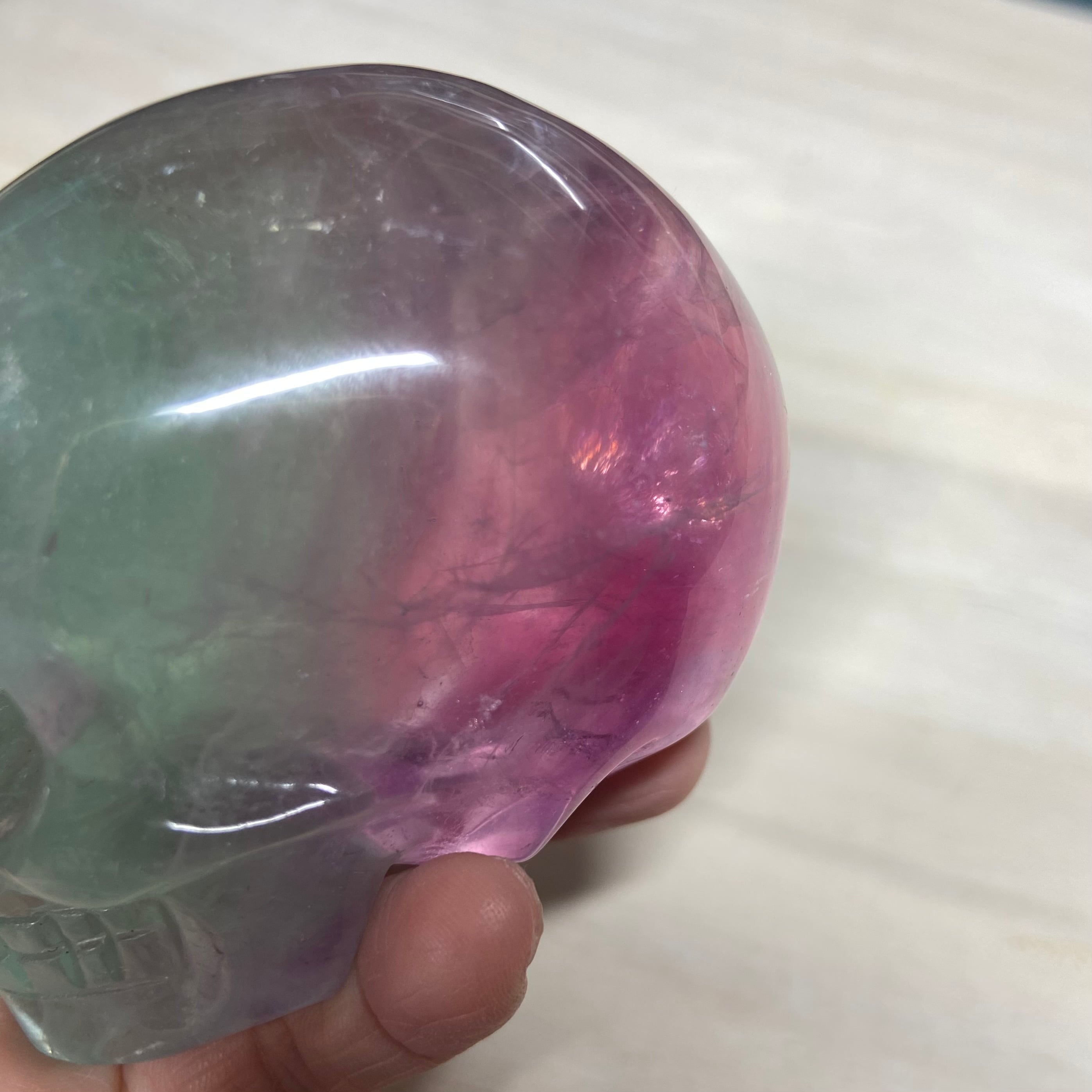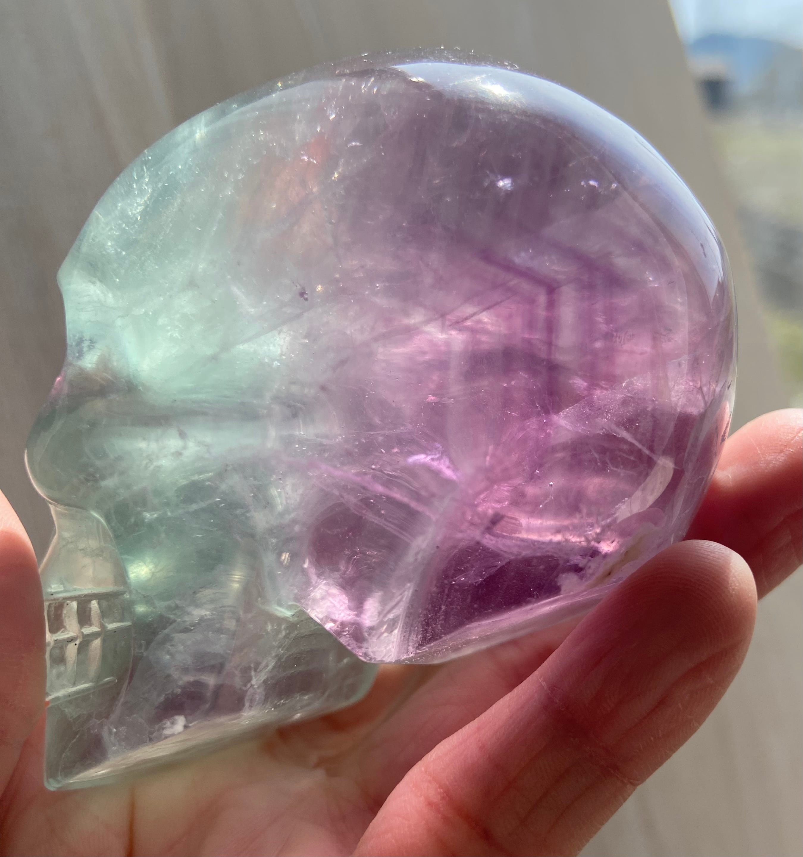バイカラーフローライト スカル 約8cm|高透明 グリーン×パープルの美しいグラデーション